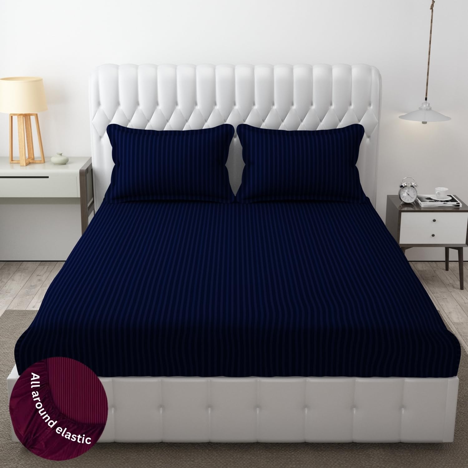 Homecrown Cotton Feel Striped Elastic Fitted Double Bedsheet with 2 Pillow Covers – 72x78 Inch – Dark Blue