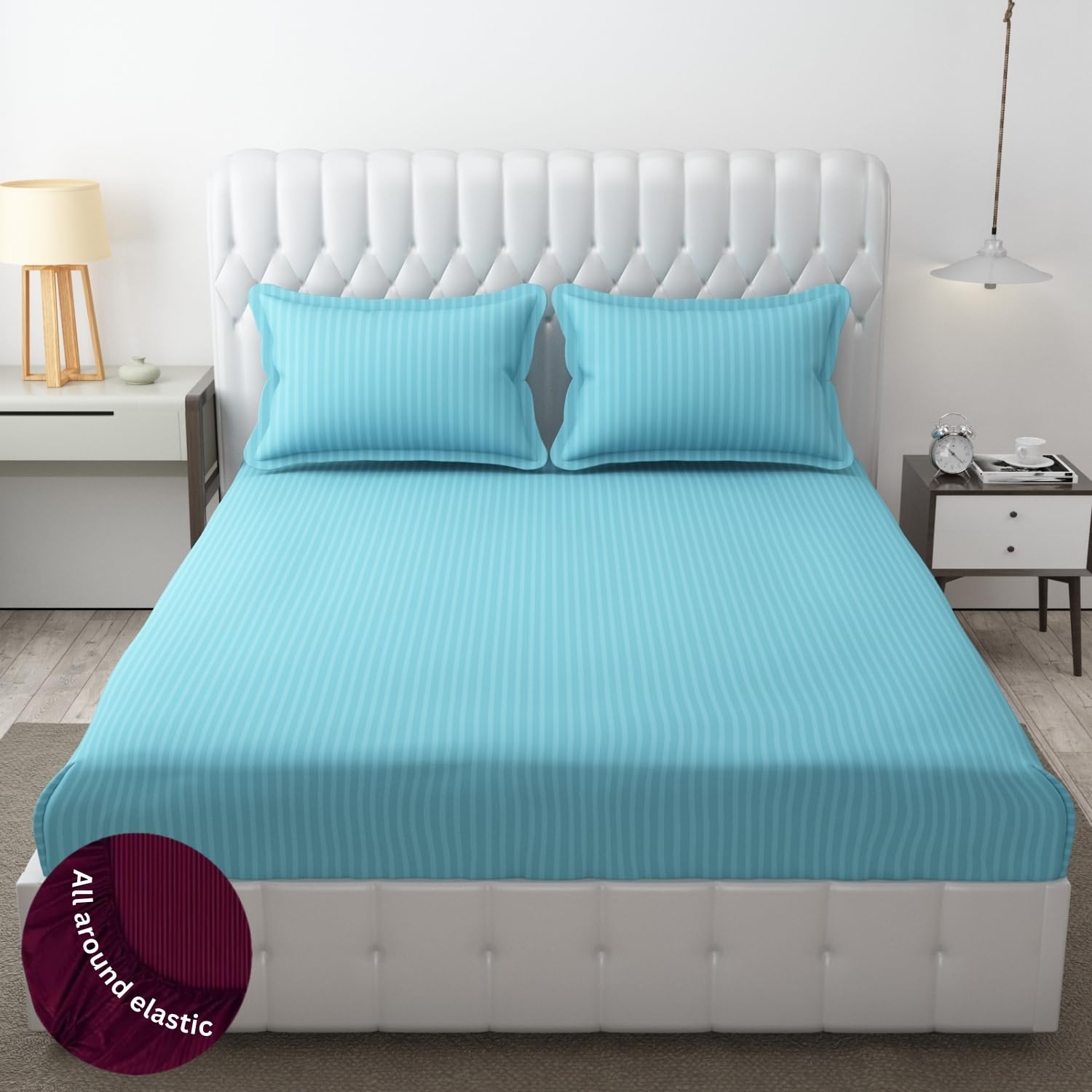 Homecrown Cotton Feel Striped Elastic Fitted Double Bedsheet with 2 Pillow Covers – 72x78 Inch – Light Blue