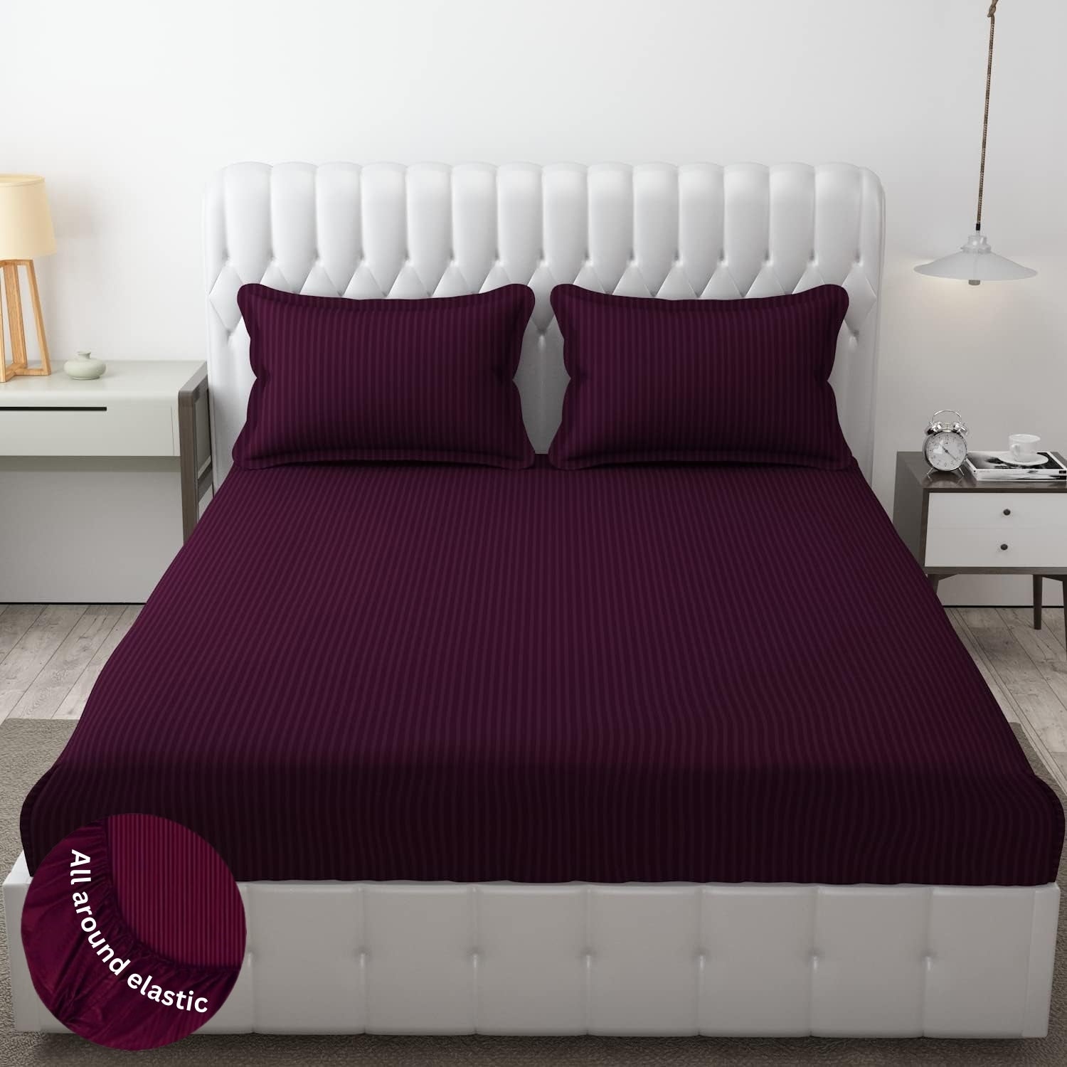 Homecrown Cotton Feel Striped Elastic Fitted Double Bedsheet with 2 Pillow Covers – 72x78 Inch – Wine