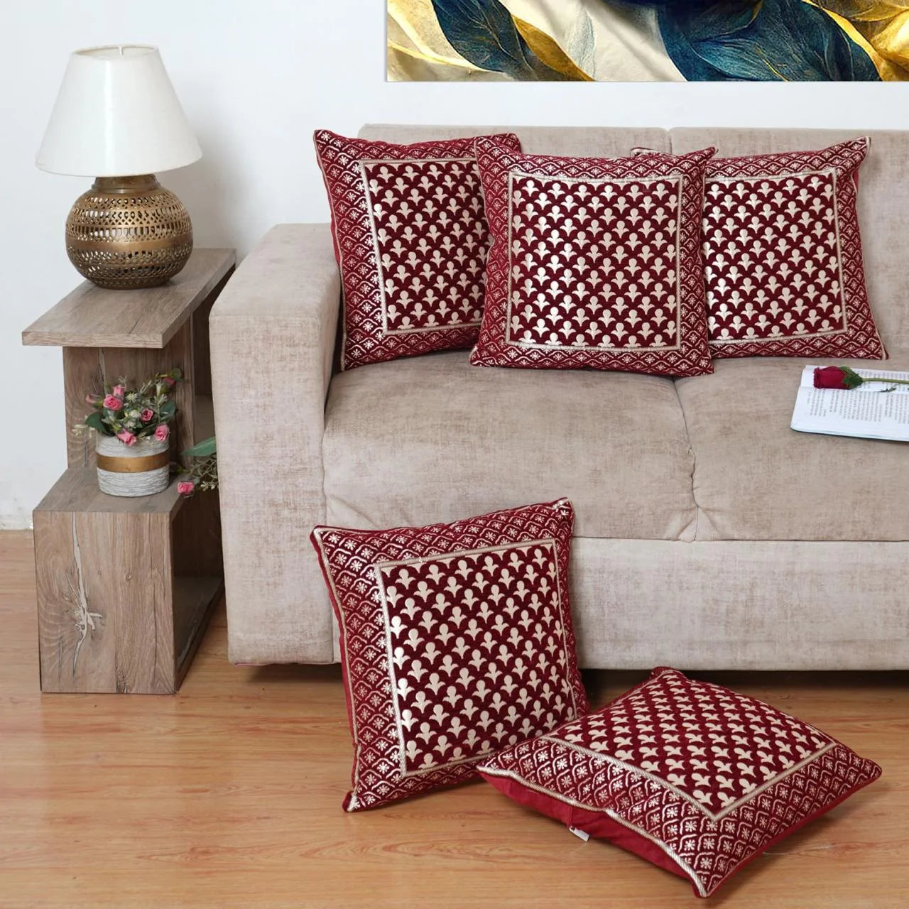 Homecrown Ethnic Design Velvet Cushion Covers 16x16 Inch – Set of 5 (Maroon)