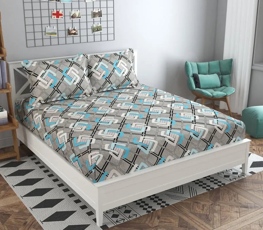 Homecrown Glace Cotton Elastic Fitted Bedsheet with 2 Pillow Covers (78X72 Inches, Geometric Multi)